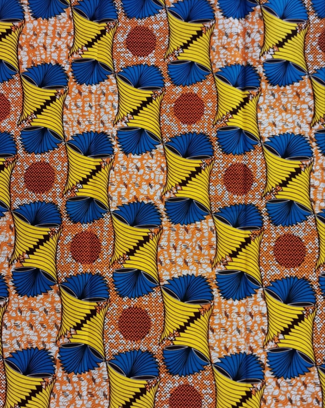 Tissu wax 100% coton. Avec une impression de très belles qualités et des couleurs vives, un design unique et dynamique.
