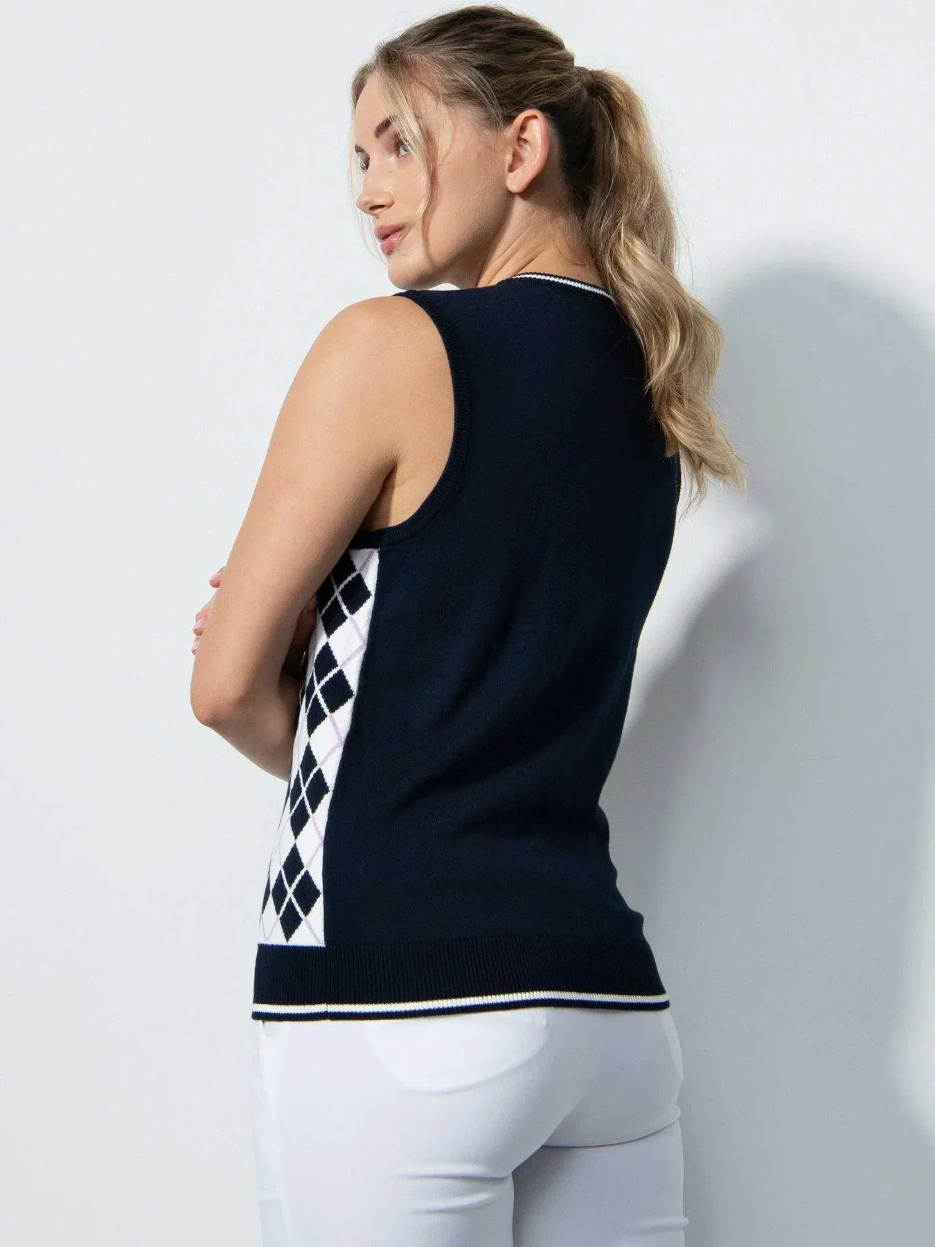 Modèle: Abruzzo V-neck Golf Vest Style: DS1000165.154 Couleurs disponibles: Marine/Blanc Le gilet à col en V Abruzzo présente un motif à carreaux argyle en tricot jacquard bleu foncé et blanc. Le dos est uni avec des poignets côtelés aux emmanchures et en bas. Le coton avec une touche de cachemire est à la fois doux […]