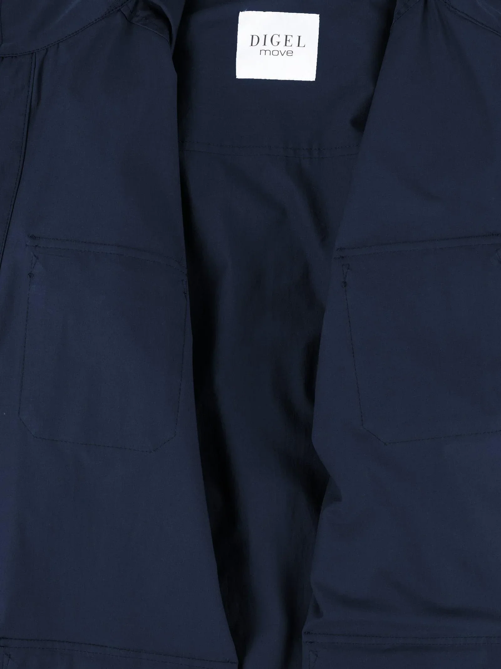 Deux pochesà rabat sur la poitrine, deux poches à rabat aux niveau des hanches, une poche à l’intérieur
