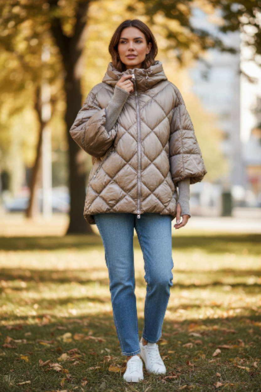Doudoune matelassée longue à capuche – Manches mitaines- Beige
