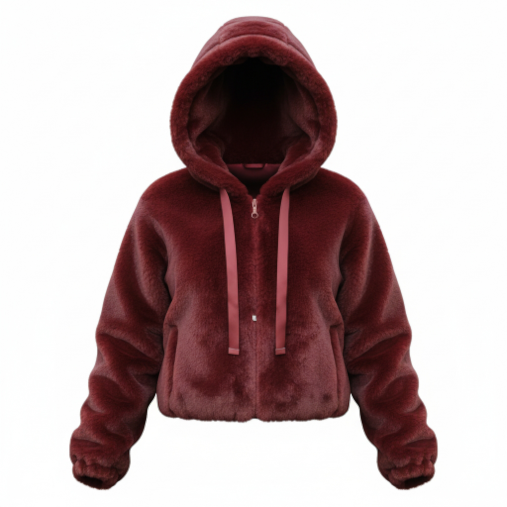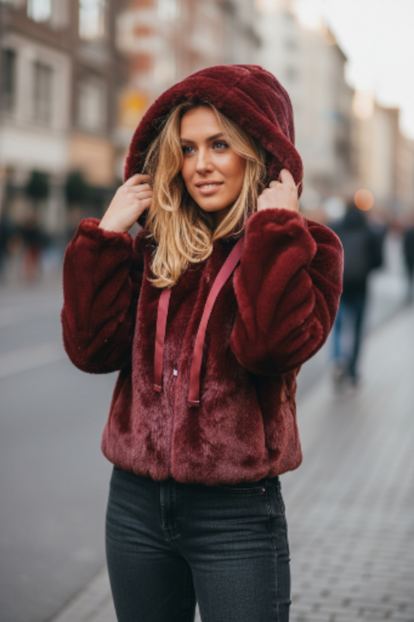 Allure urbaine et élégance assurée avec cette fourrure Bordeaux courte à capuche, dotée de deux cordons pour une touche streetwear chic.