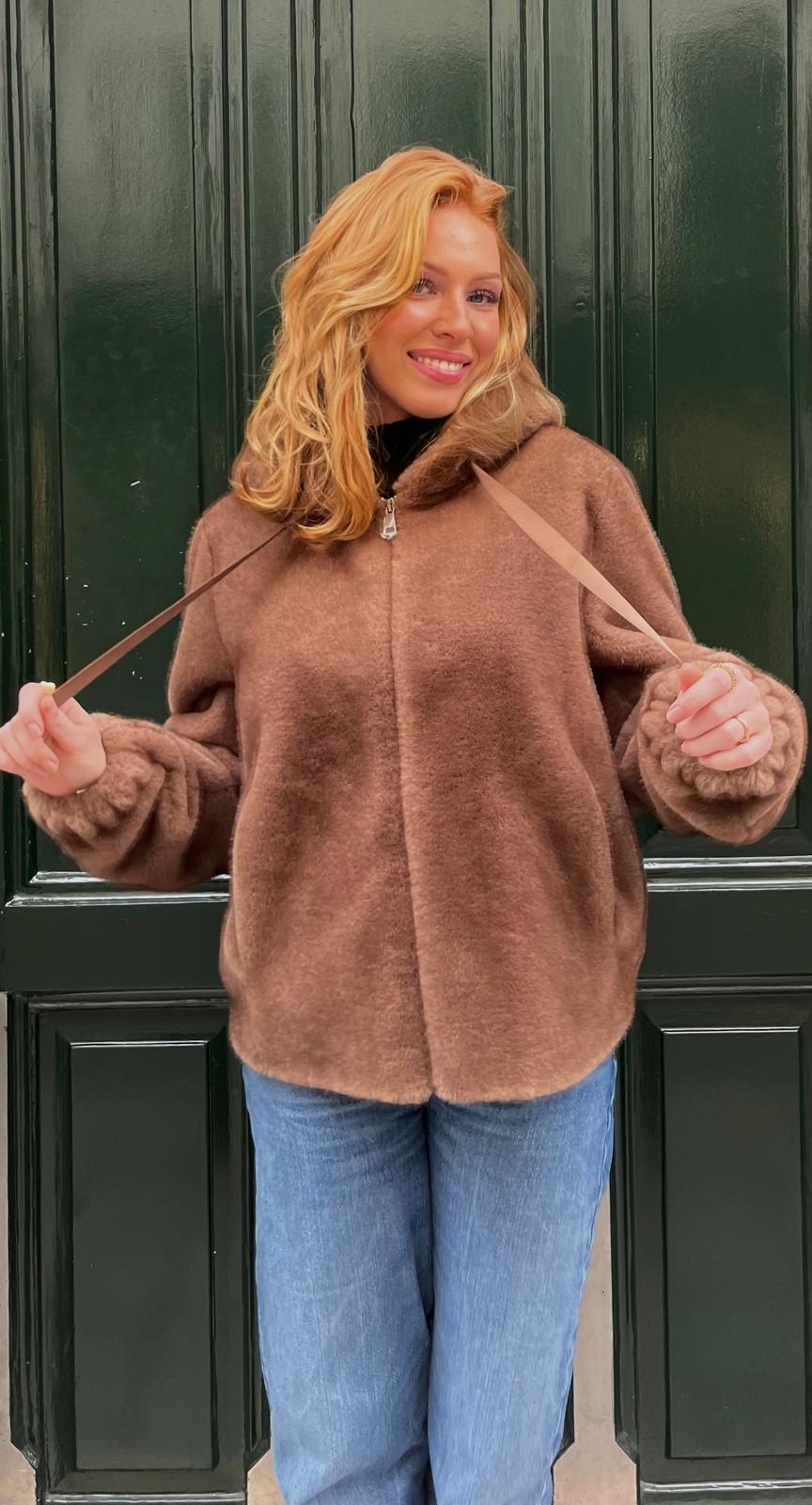 Allure urbaine et élégance assurée avec cette fourrure Camel courte à capuche, dotée de deux cordons pour une touche streetwear chic.