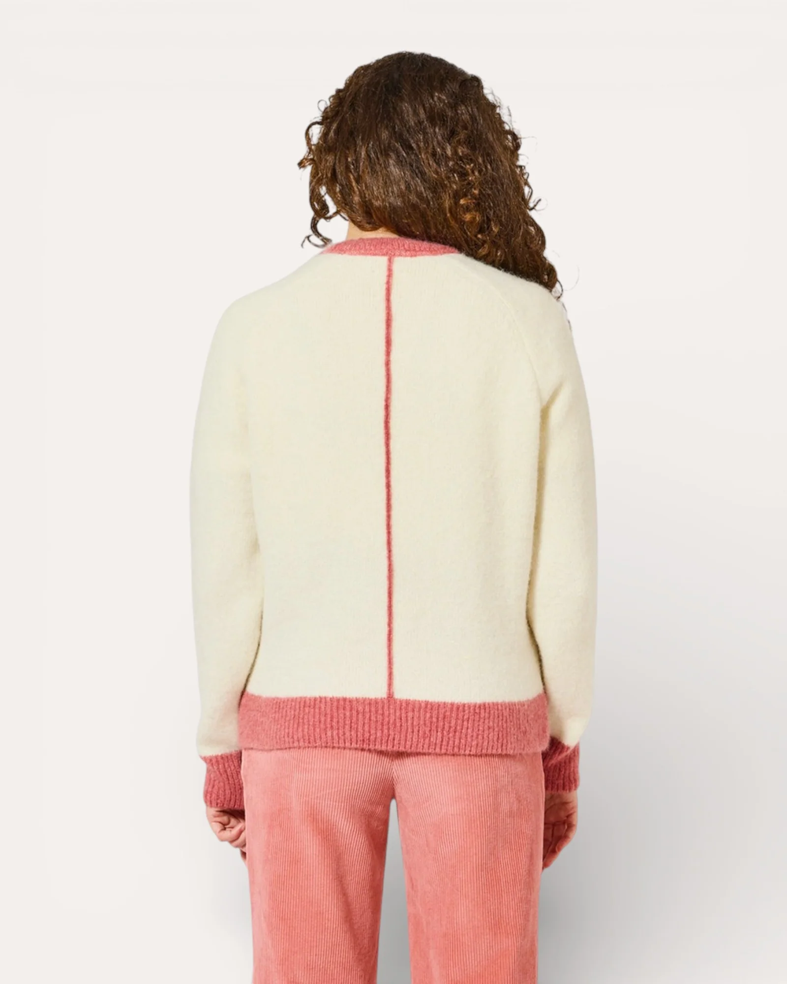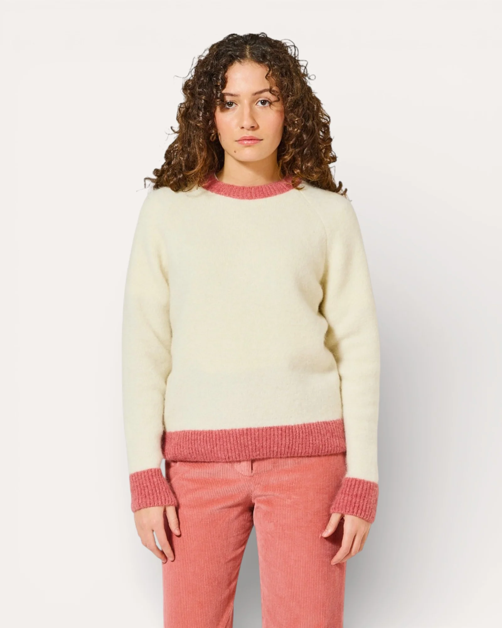 Le pull Baby Lila, décliné dans un mélange harmonieux de crème et de rose, incarne une élégance douce et affirmée. Sa maille texturée et sa coupe fluide en font un essentiel moderne, idéal pour une silhouette féminine sans effort.