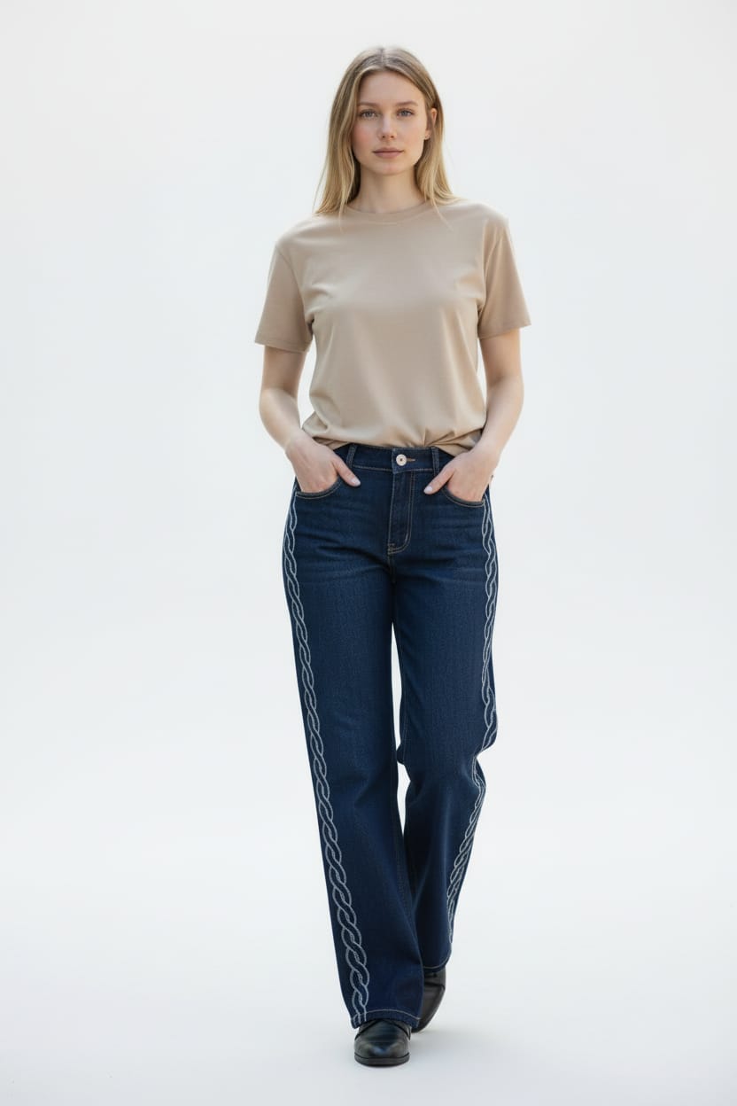 Son détail distinctif réside dans la couture en torsade qui longe les côtés des jambes. Ce travail de couture apporte du relief et une touche graphique subtile, tout en restant sobre et intemporelle. Contrairement à un simple jean uni, ce modèle se distingue par cette finition originale qui structure la jambe et attire discrètement le regard. Le denim bleu foncé renforce l’élégance de l’ensemble et permet de créer des looks aussi bien casual que plus habillés.