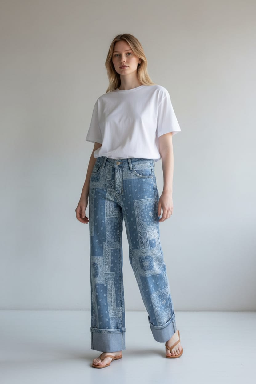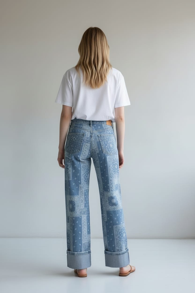 Son design patchwork inspiré des motifs bandana apporte une dimension unique et tendance à ce jean. Les différentes nuances de bleu créent un jeu de contrastes subtils qui attire le regard sans être excessif. Chaque détail est pensé pour donner à cette pièce un esprit vintage revisité, facile à intégrer dans un vestiaire contemporain. Les ourlets larges retroussés renforcent son style casual et apportent une touche mode supplémentaire.