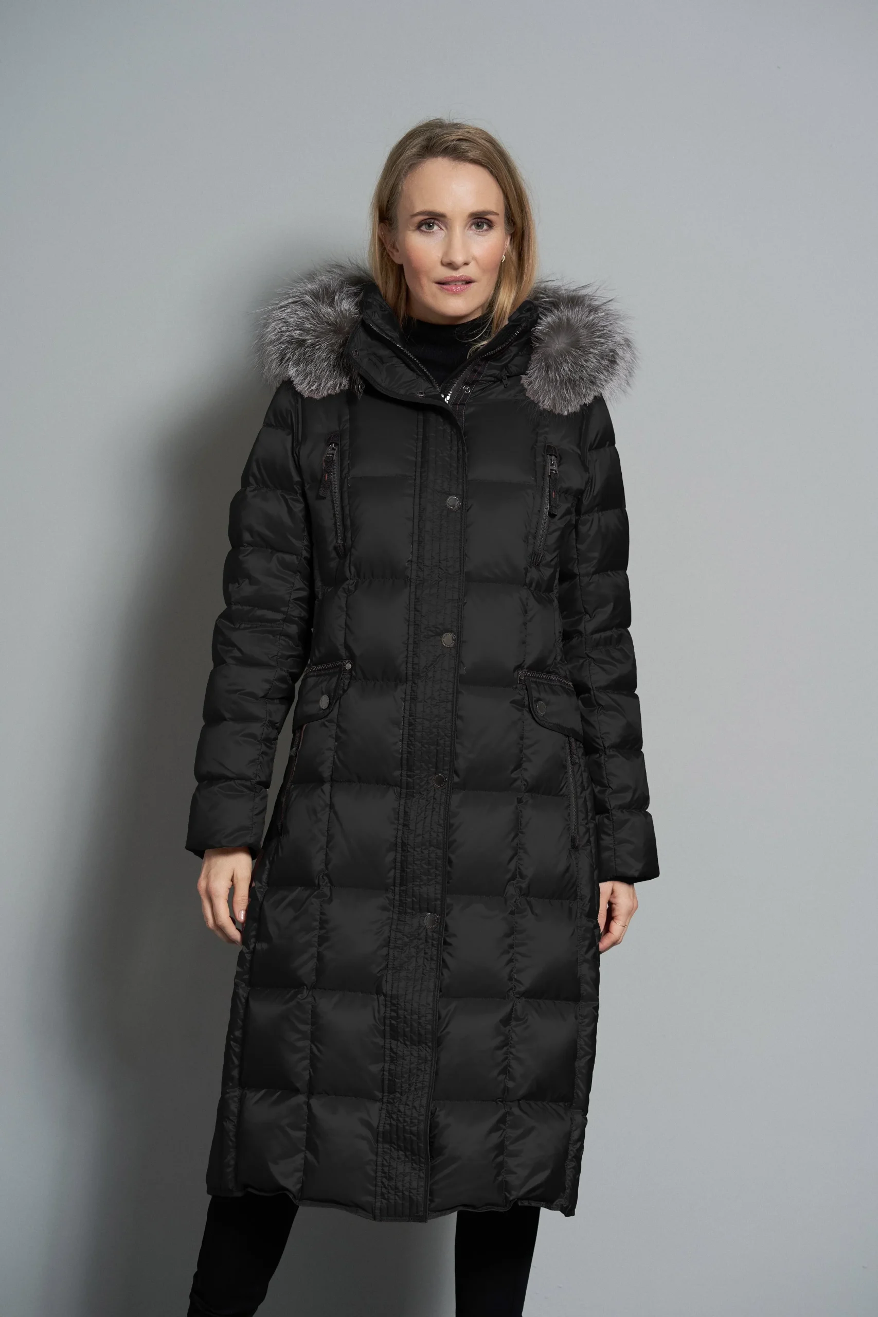 Doudoune avec fourrure de renard argenté sur capuche amovible. Une fermeture à glissière et à pression et une fente avec fermeture à glissière à l’arrière.