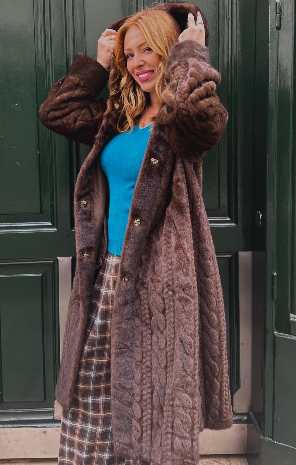 Craquez pour ce long manteau en fourrure torsadé marron, la touche chic et cosy parfaite pour sublimer vos tenues hivernales.