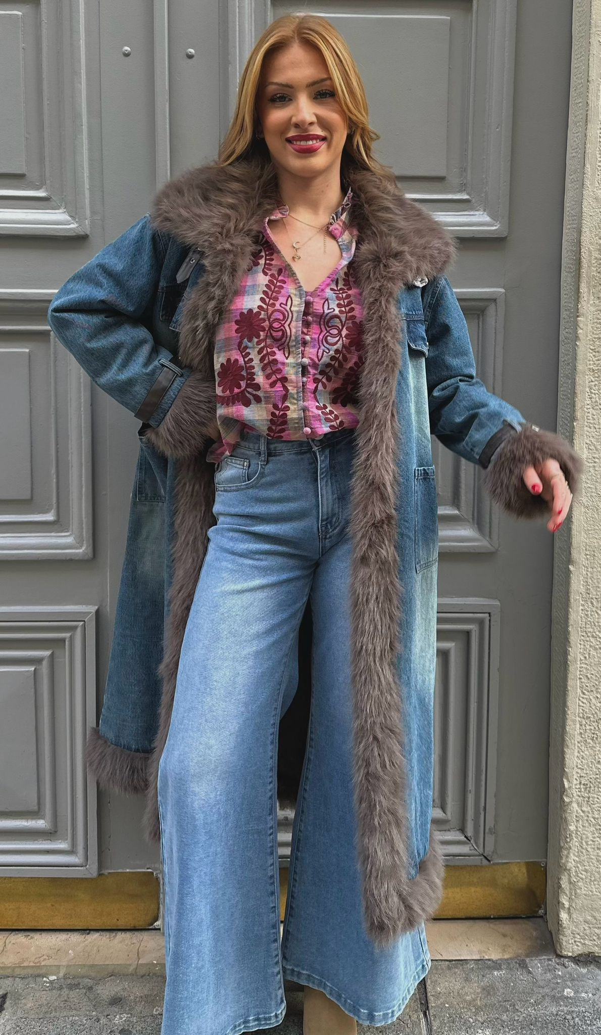 Manteau en jean au style casual et tendance avec fourrure, parfait pour un look urbain et décontracté.