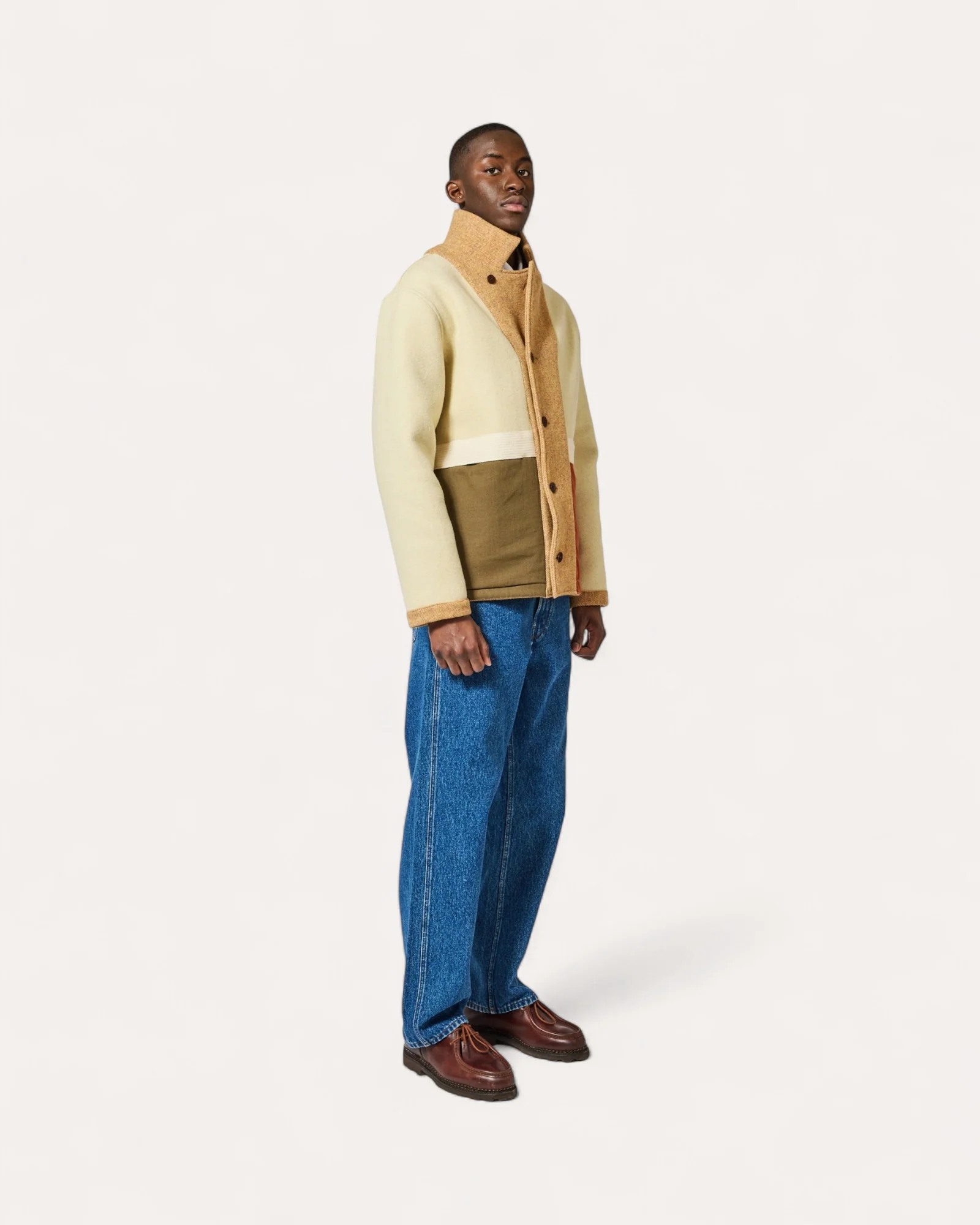 Ce manteau réversible à coupe droite joue astucieusement sur les contrastes entre l’intérieur et l’extérieur. Le tissu Casentino Gold (une laine texturée renommée) lui confère une qualité visuelle unique et chaleureuse.