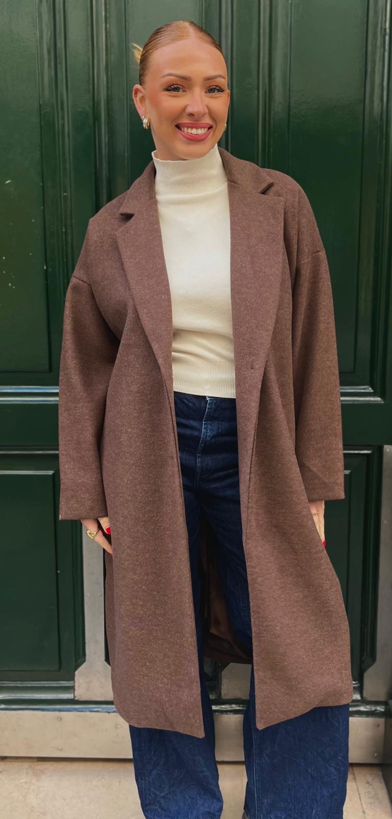 Découvrez notre manteau long uni, une pièce intemporelle qui sublime chaque silhouette (marron).