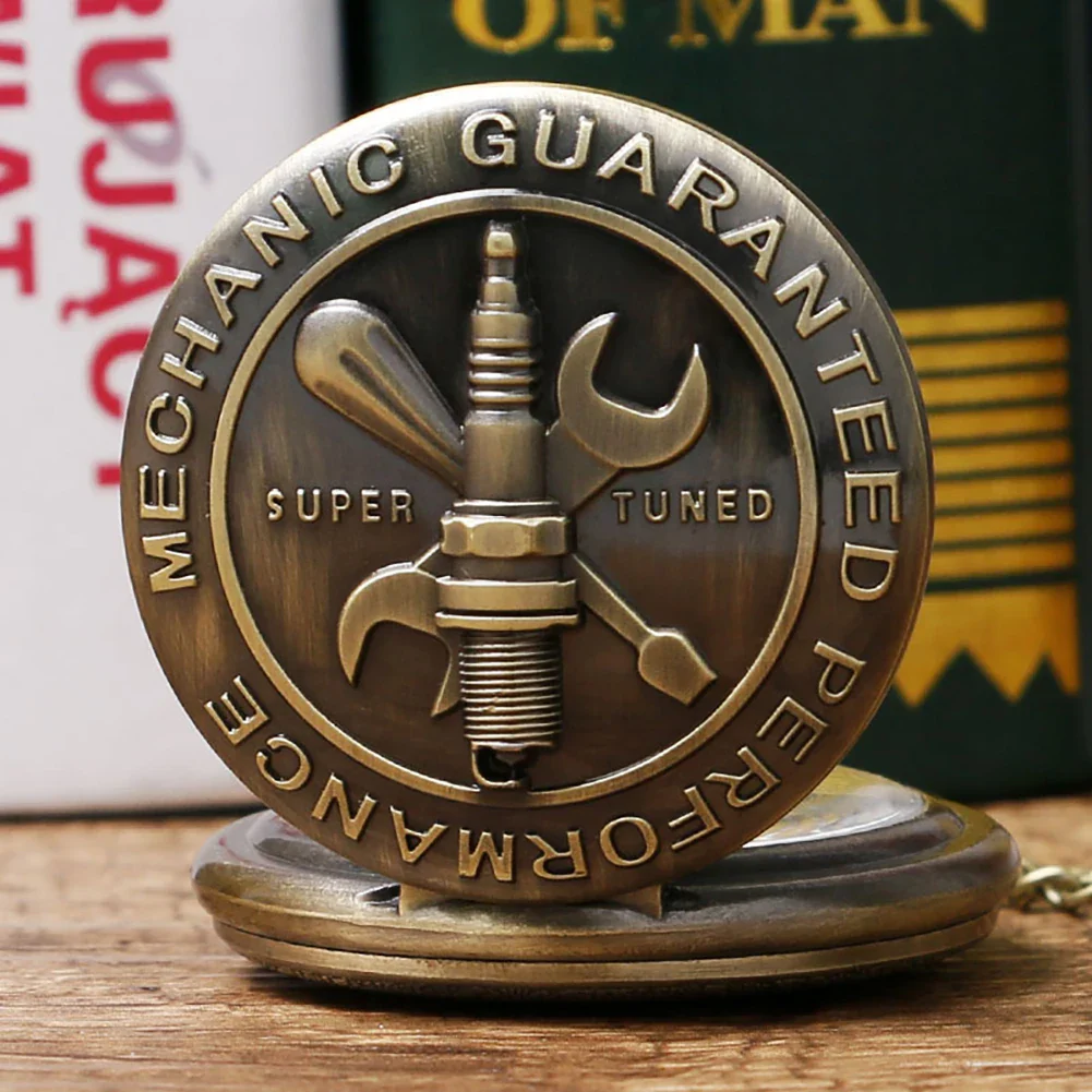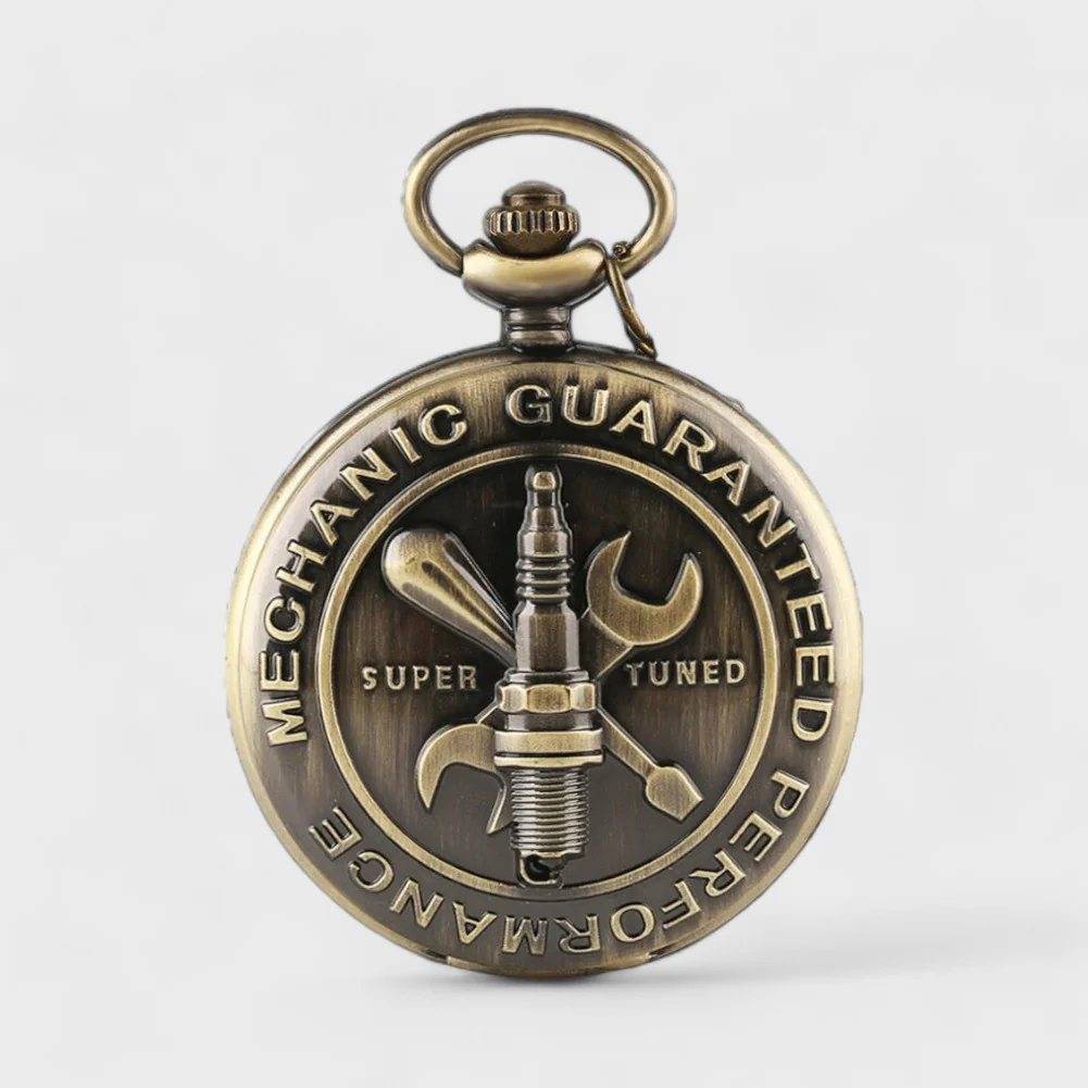 Cette montre de poche vintage célèbre le monde de la mécanique avec un design audacieux. Sur le couvercle, des outils emblématiques comme une clé et une bougie d’allumage s’entrelacent, affirmant un style à la fois robuste et raffiné. Fabriquée avec un boîtier en bronze vieilli, elle évoque l’esprit des ateliers et des passionnés de mécanique.