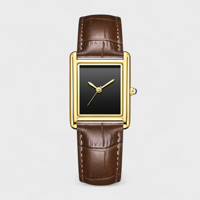 Son boîtier carré doré et son cadran noir profond évoquent une allure raffinée et intemporelle, tandis que le bracelet en cuir texturé — disponible en bleu nuit ou marron chaud — souligne sa sophistication naturelle.