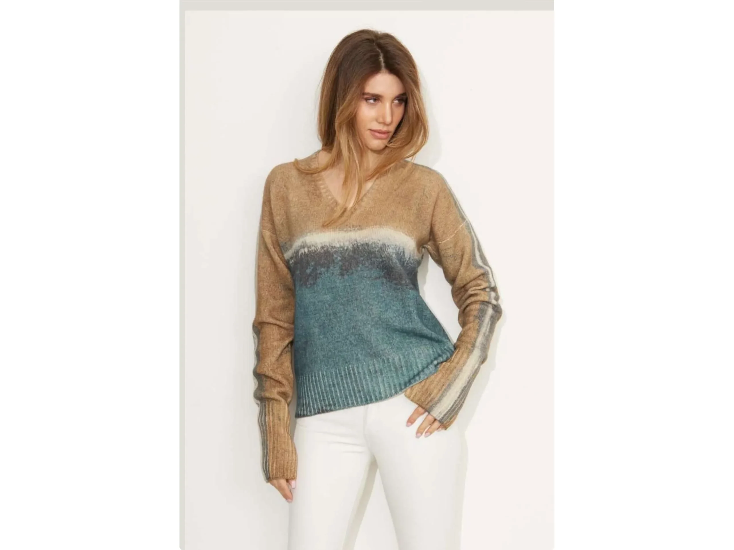 Ce pull en V 4 plis, 100% cachemire, offre une douceur exceptionnelle et une élégance subtile grâce à son dégradé de couleurs raffiné.