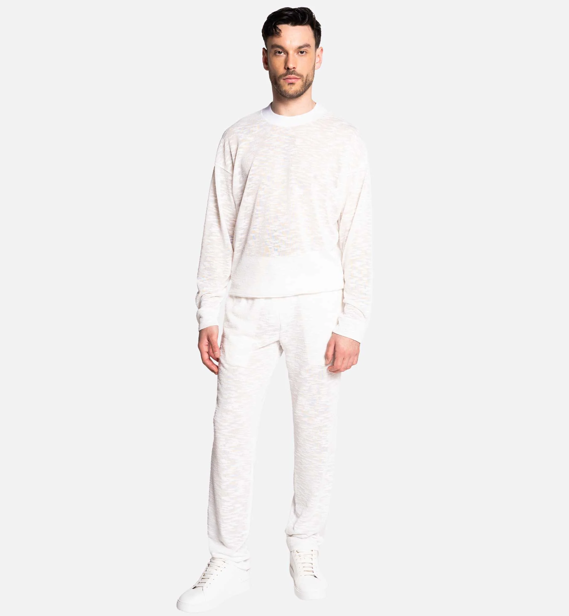 Portez sur la totale-apparence avec le pantalon d’une coupe droite en maille blanc cassé, une ceinture élastiquée avec cordon