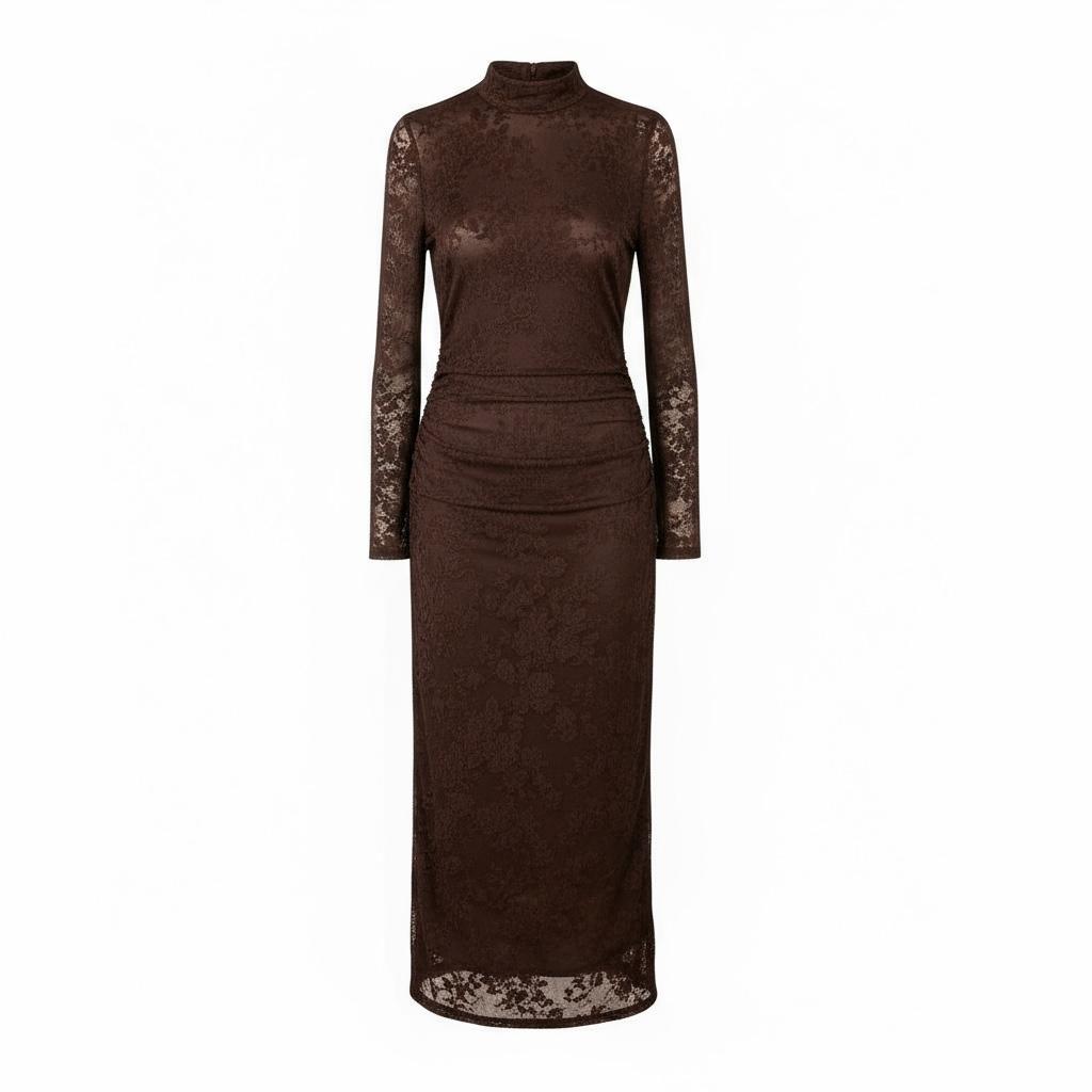 Sublime et audacieuse, cette longue robe marron joue avec la transparence aux bras et aux genoux pour un look élégant et moderne.