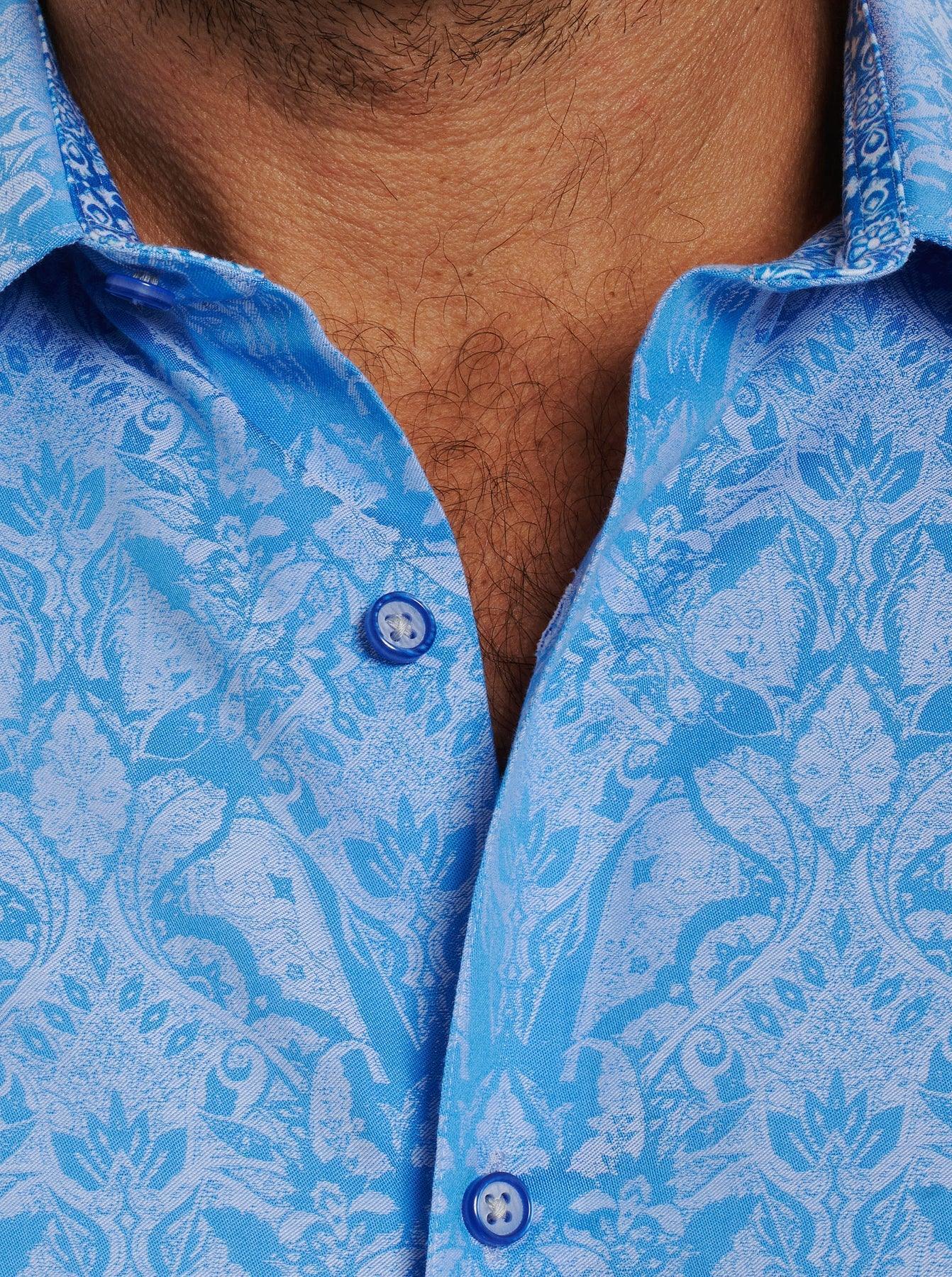 Vous avez adoré Le jacquard Andretti – un best-seller de RG et un favori des collectionneurs. Découvrez maintenant notre nouveau jacquard incontournable, The Highland. Un motif damassé est célébré sur cette chemise boutonnée à manches longues en jacquard de coton stretch. Retournez le col pour un imprimé contrasté.