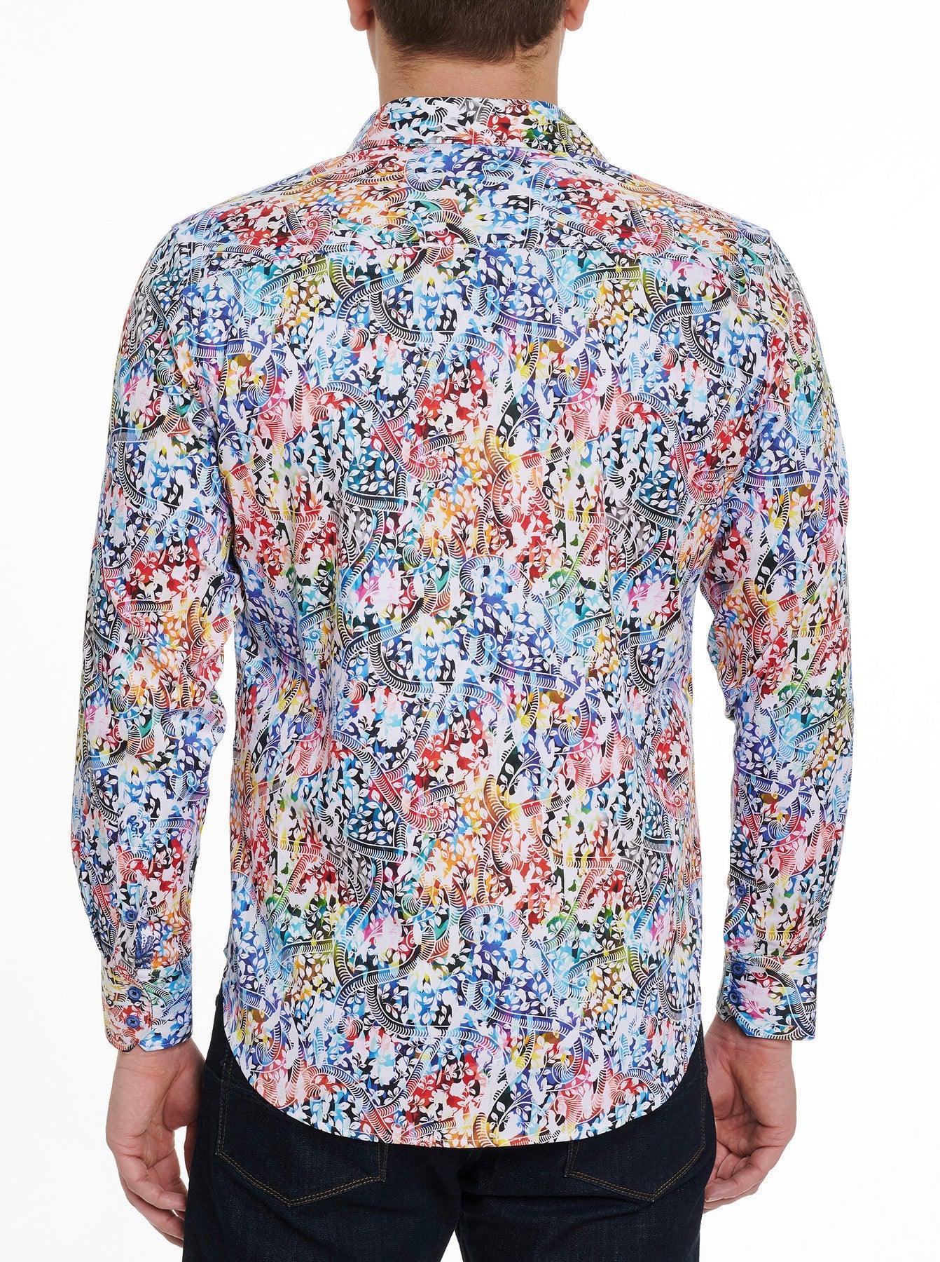 Tourbillons et fleurs – tout est réuni sur cette chemise de sport en coton stretch arc-en-ciel #WearableArt de Robert Graham. Recherchez les vignes traînantes et les boutons céruléens.