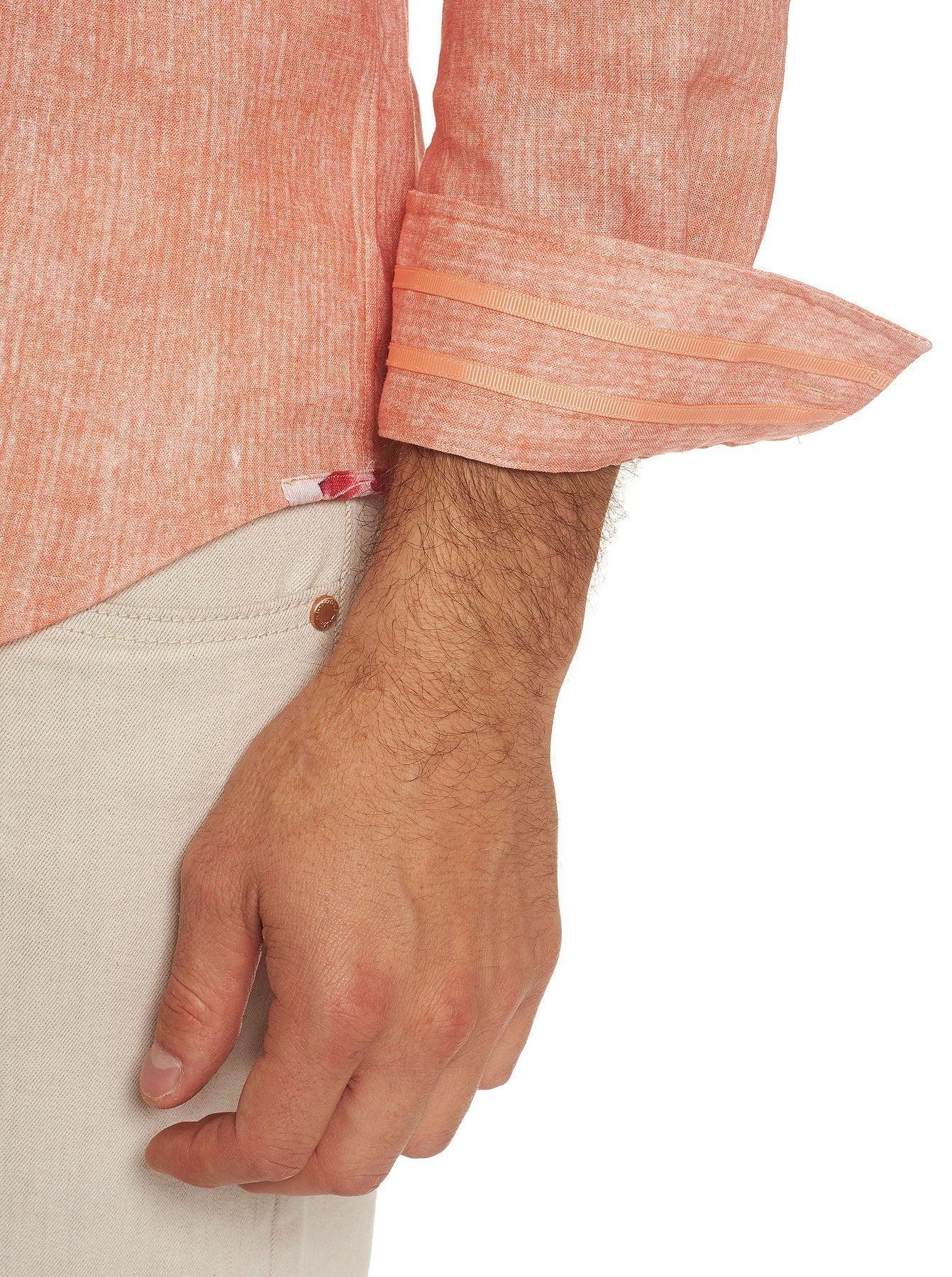 Un subtil motif hachuré modernise cet étourdissant mélange de lin. Retournez le poignet pour voir les rubans doubles tandis qu’un motif floral se retrouve juste derrière le bouton du haut du cou et sur les boutons du poignet.