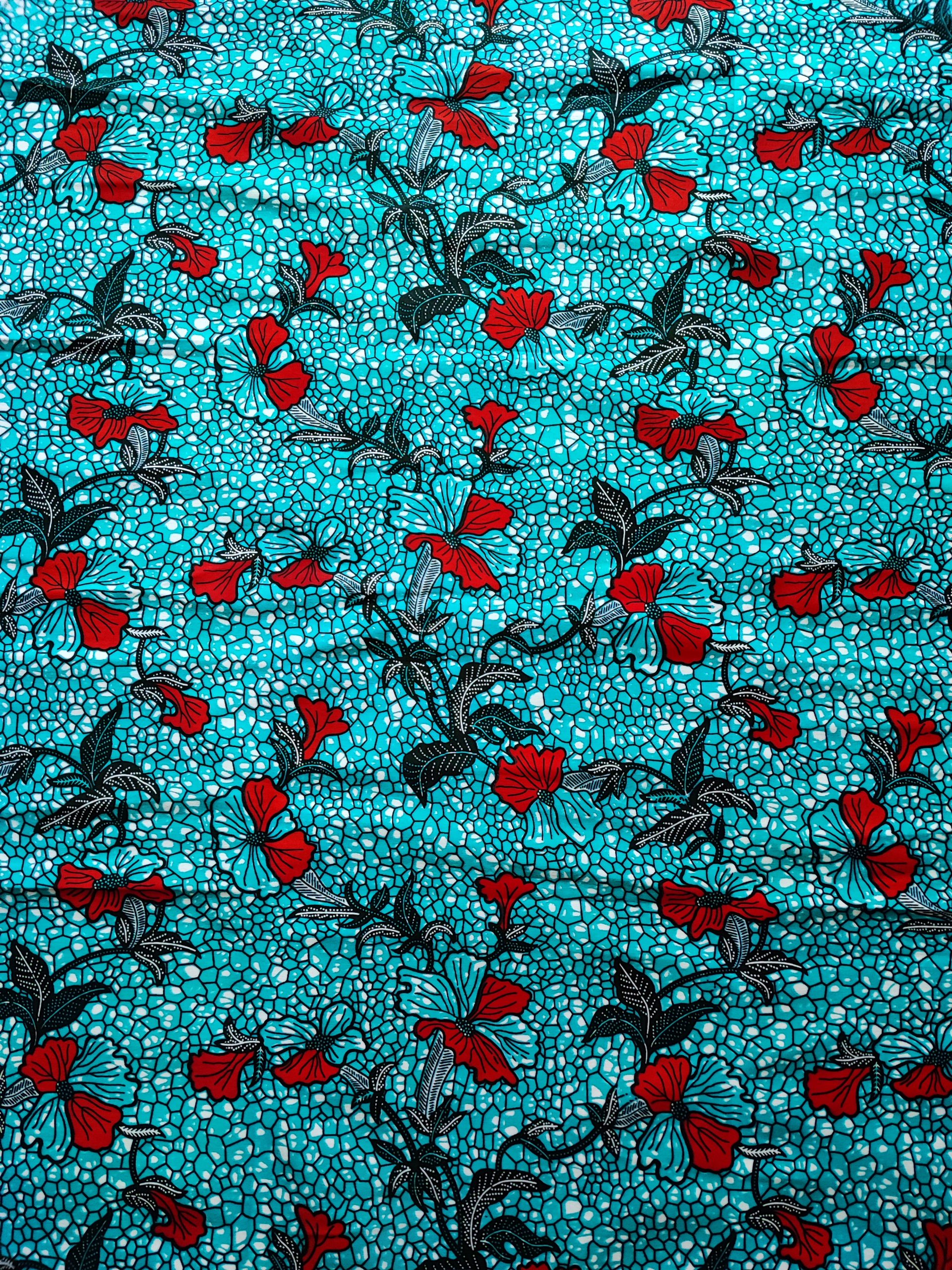 Tissu wax 100% coton. Avec une impression de très belles qualités et des couleurs vives, un design unique et dynamique.