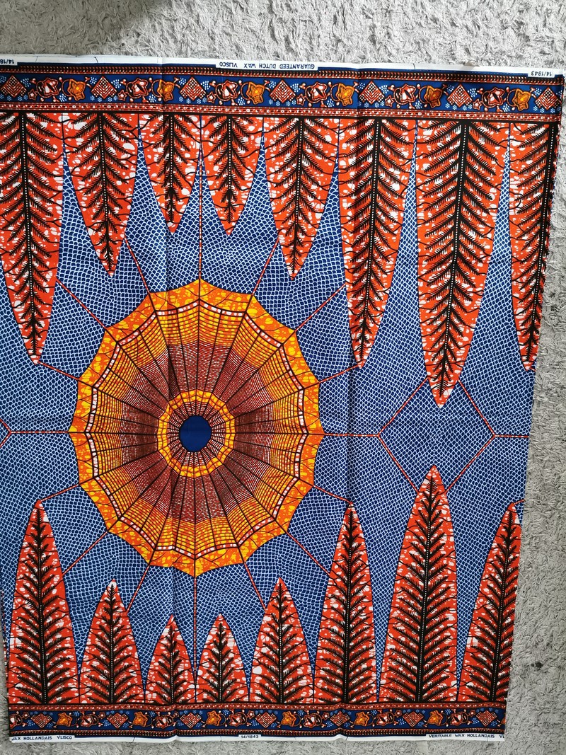 Tissu wax 100% coton. Avec une impression de très belles qualités et des couleurs vives, un design unique et dynamique.