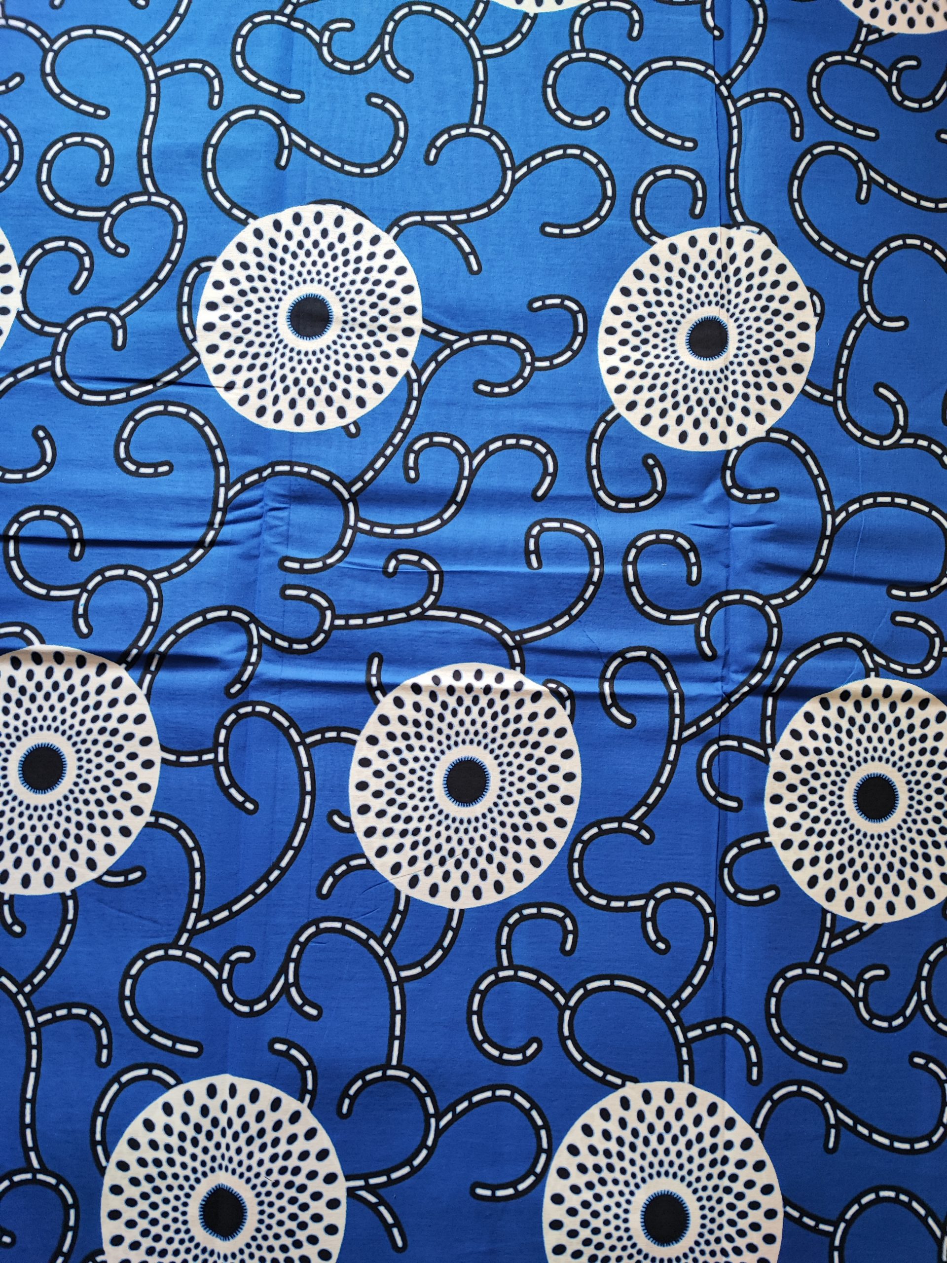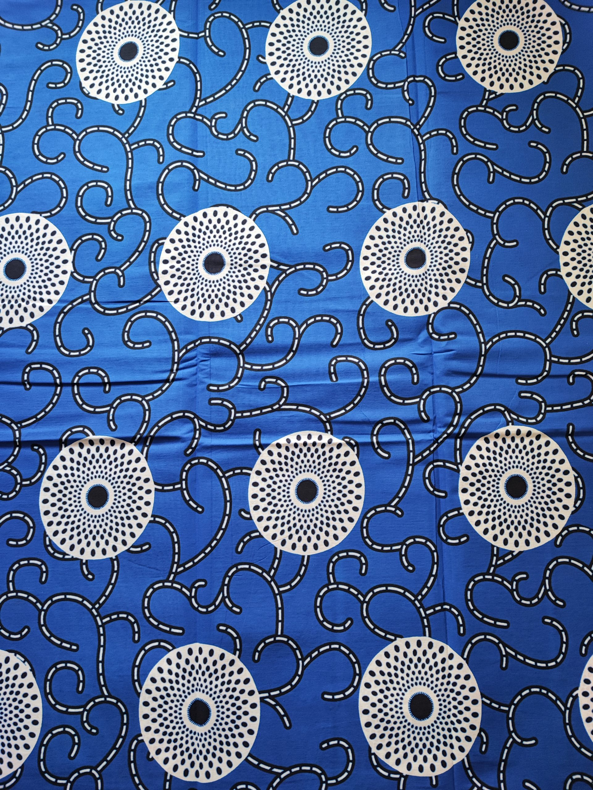 Tissu wax africain motif macaron et disque sur fond bleu