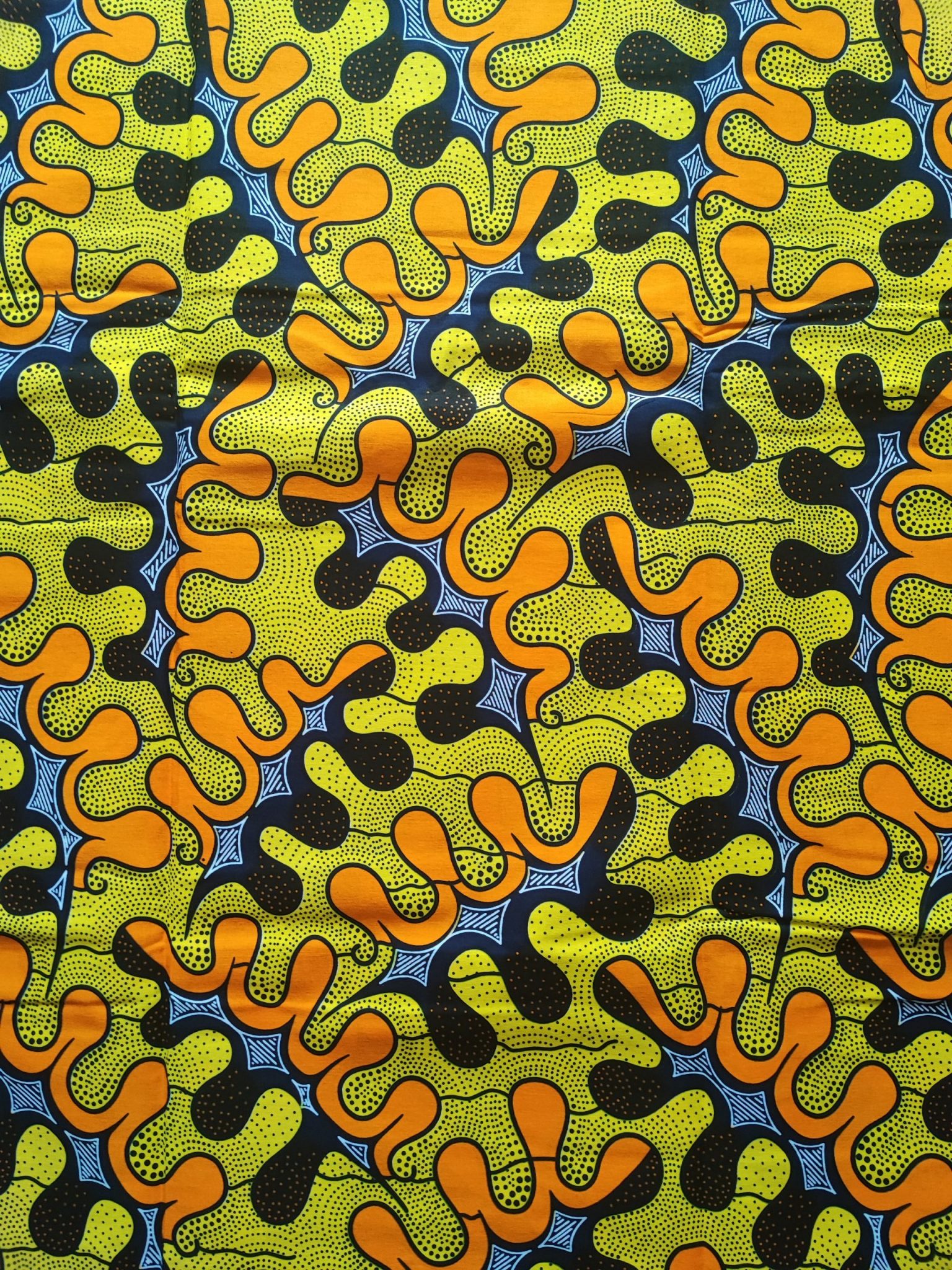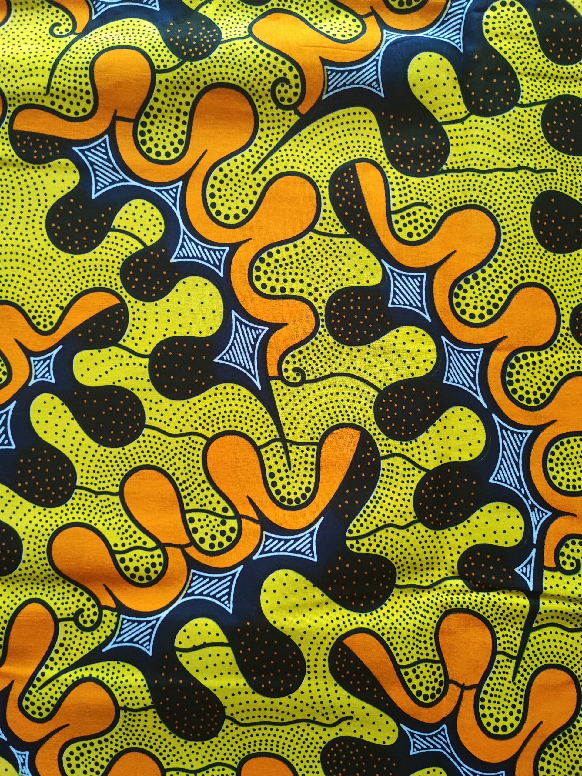 Tissu wax 100% coton. Avec une impression de très belles qualités et des couleurs vives, un design unique et dynamique.