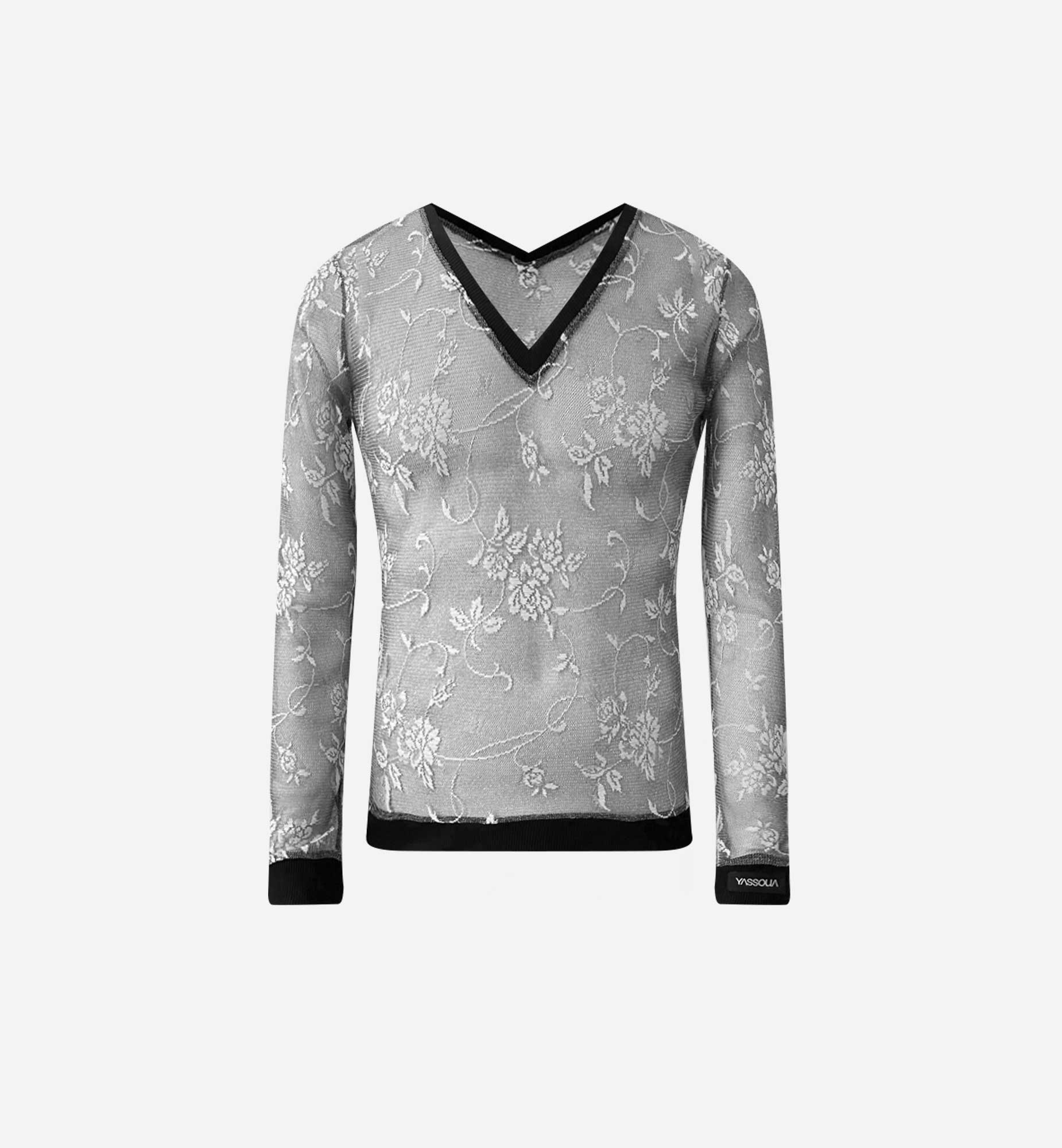 Le haut col V en maille argentée stretch brodée de Yassoua Paris