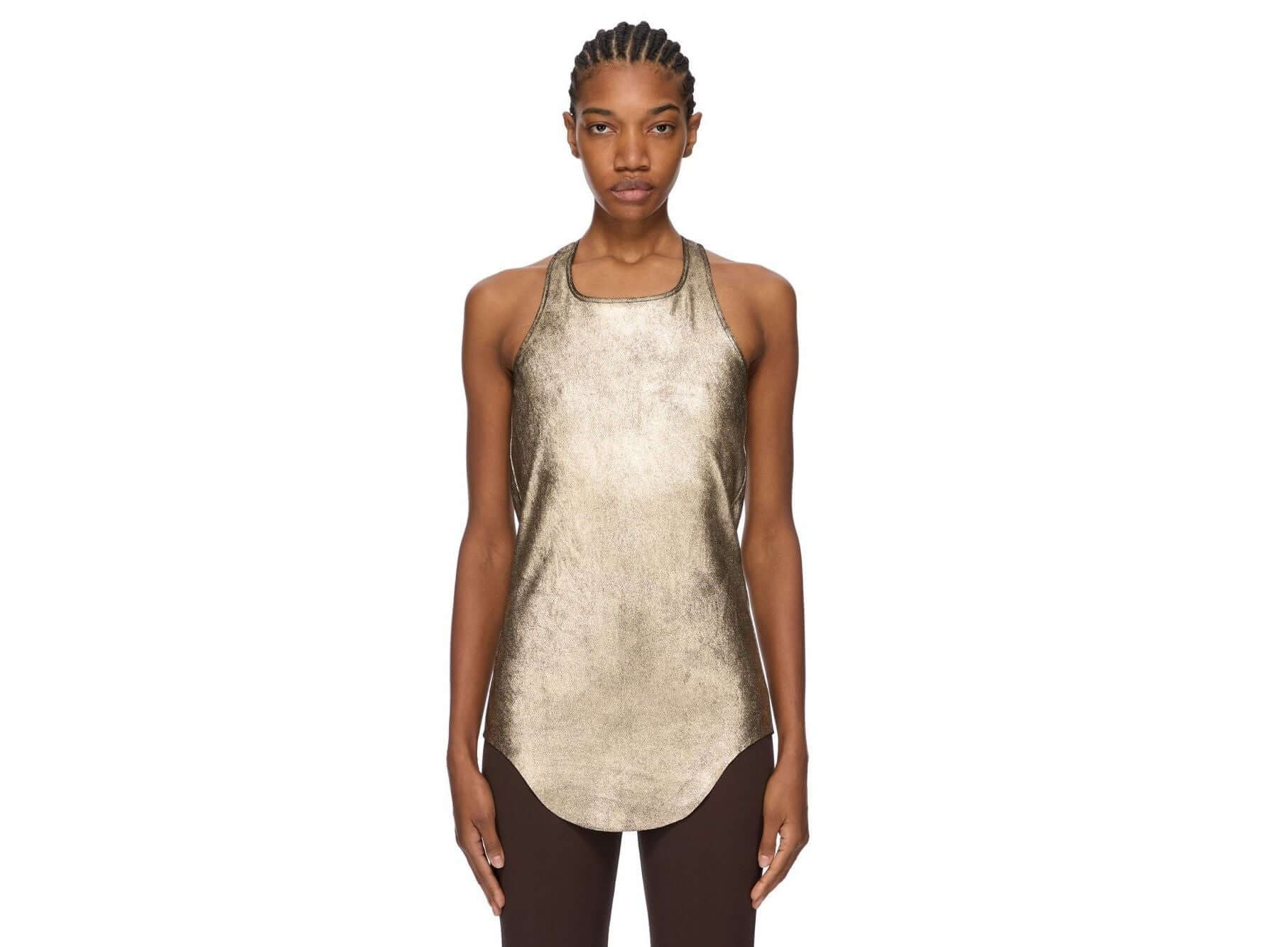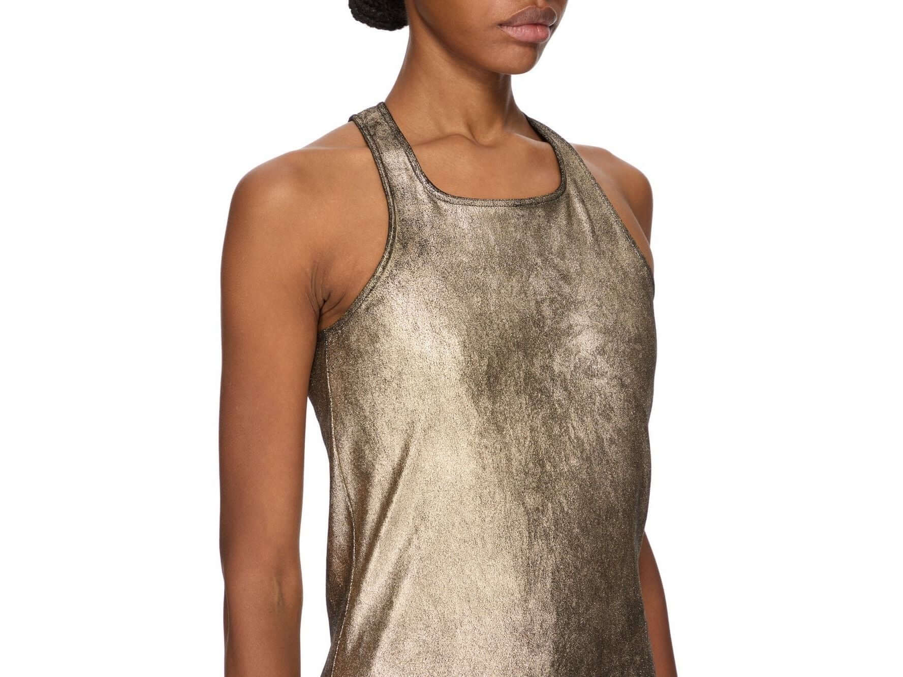 Ce top en cuir d’agneau stretch or métallisé allie élégance et confort grâce à sa coupe courte, son ourlet brut arrondi et son dos nageur minimaliste. Sa matière exclusive, issue d’une tannerie du Sud de la France, offre une douceur exceptionnelle et une finition dorée raffinée. La couture centrale au dos accentue sa silhouette, sublimant chaque mouvement. Adoptez cette pièce unique pour un style audacieux et sophistiqué au quotidien.