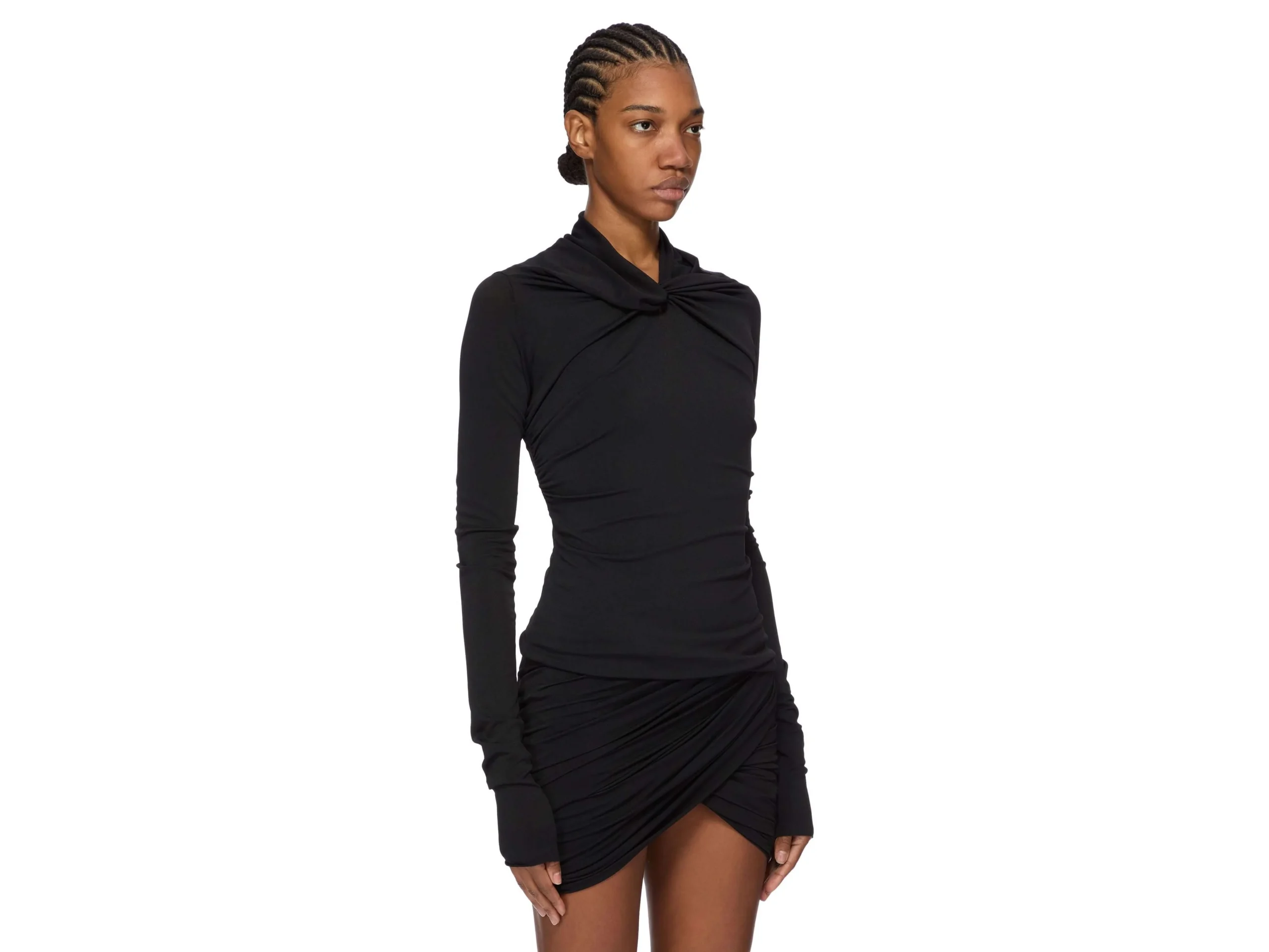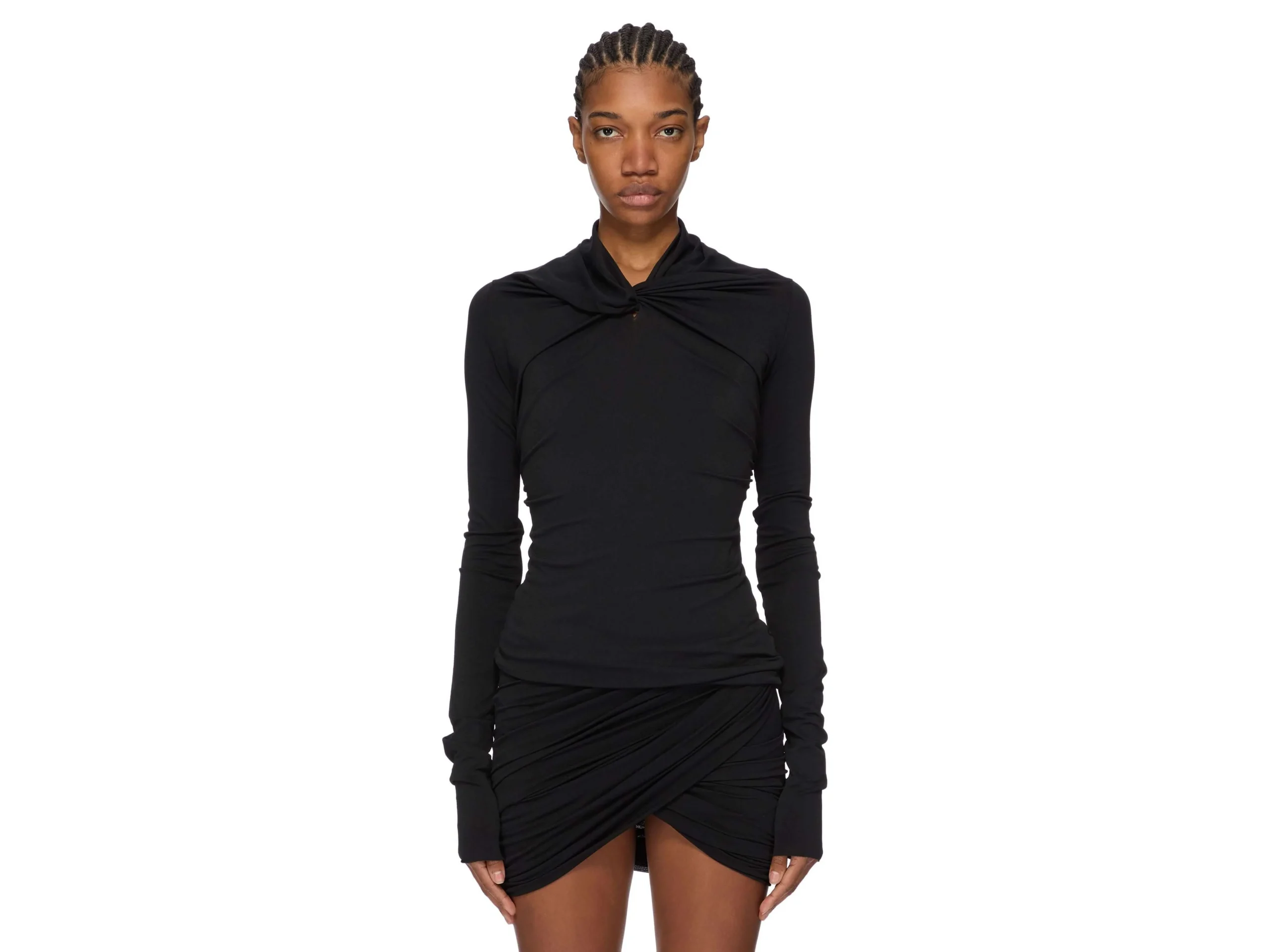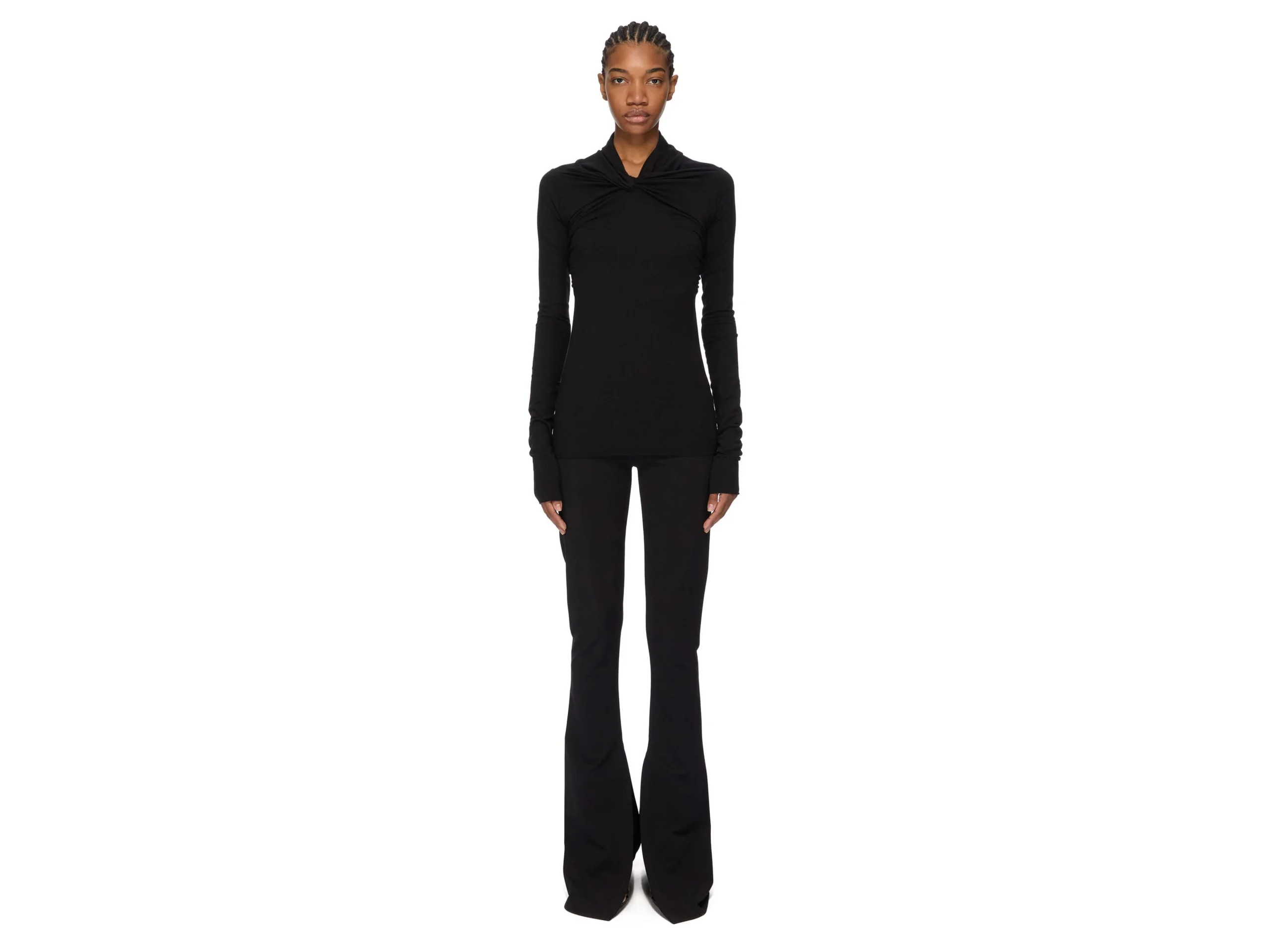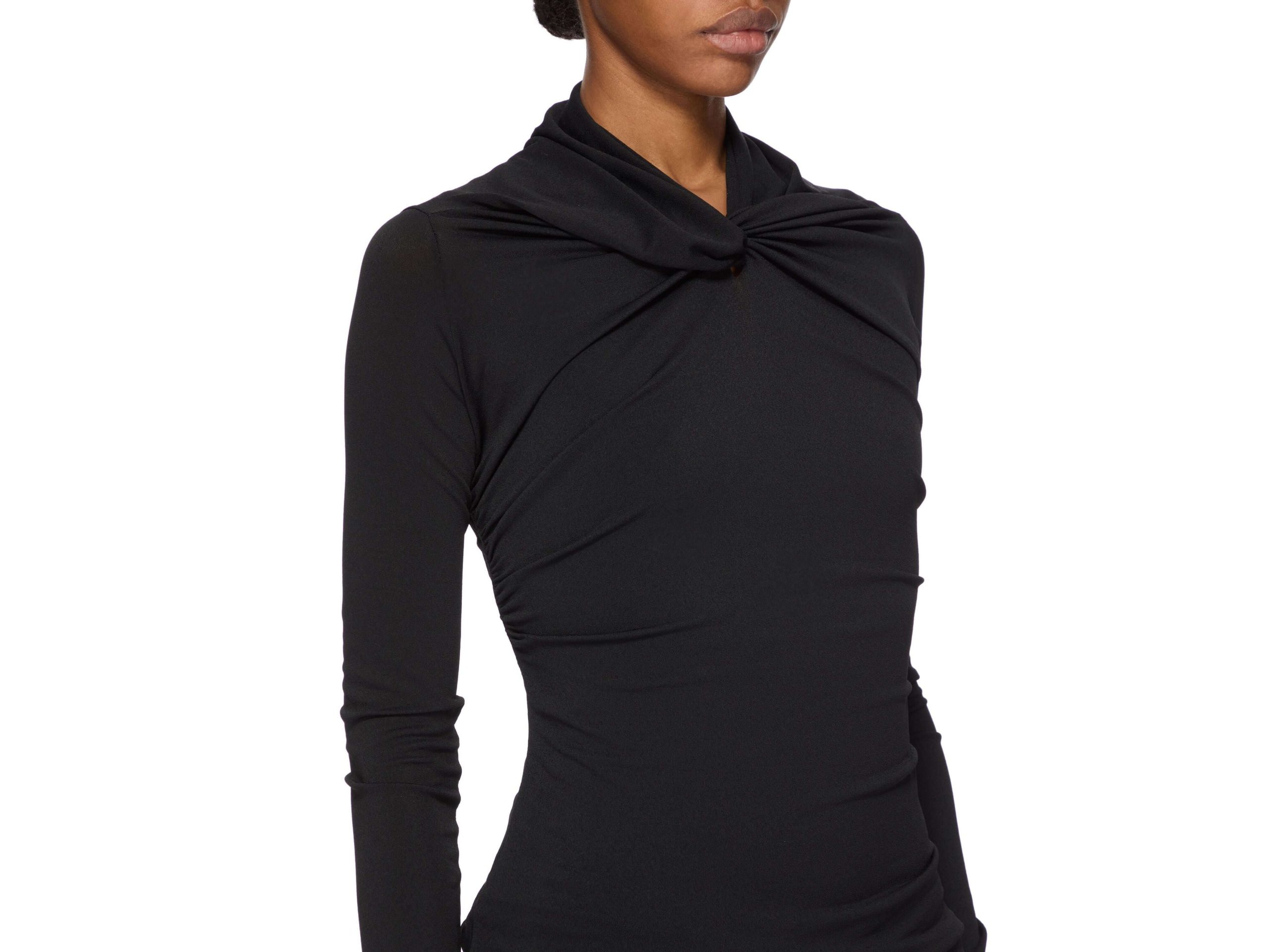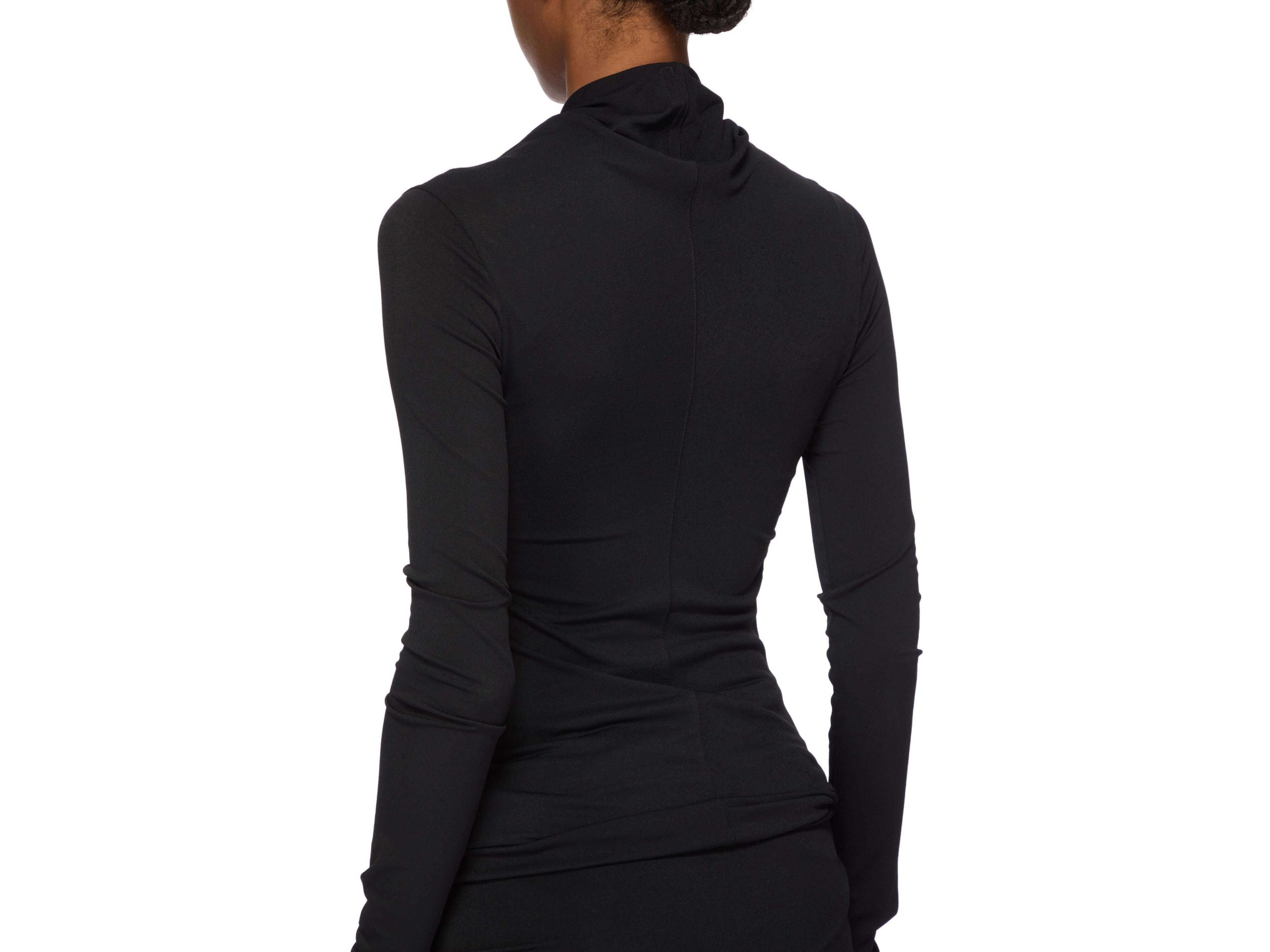 Le top Kairo de Rick Owens incarne le luxe contemporain par la retenue architecturale. Confectionné en jersey de crêpe viscose certifié, cette silhouette sous la hanche se distingue par son col châle sculptural avec torsion frontale et drapés gracieux aux épaules—signatures de l’esthétique raffinée du créateur. La fluidité du tissu et son élasticité naturelle épousent le corps sans effort, tandis que la face mate du crêpe contraste magnifiquement avec son revers doux. La viscose responsablement sourcée garantit excellence tactile et intégrité environnementale. Une pièce d’investissement essentielle pour la garde-robe exigeante.